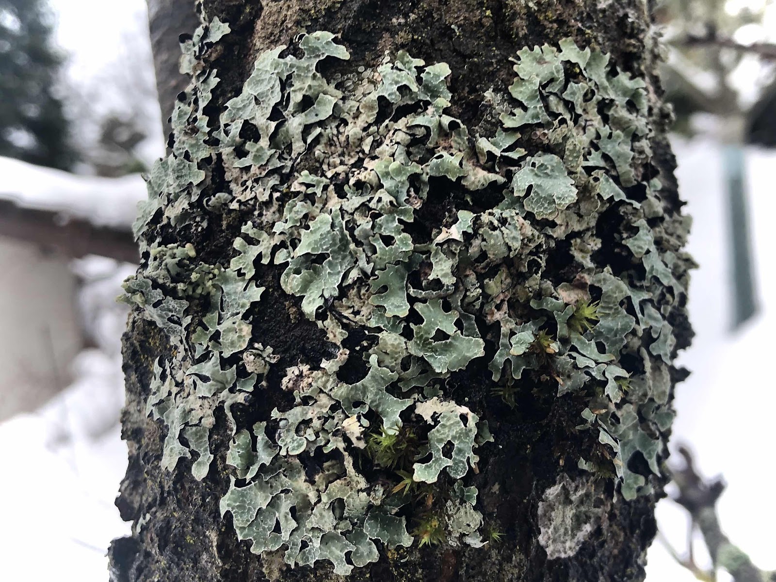 Anmut schneebedeckter Wiese Ruhe nickt uns freundlich zu - Gegerbte Rinde schützt alter Bäume innere Reinheit - Weisse Pracht weist dem Auge den Weg zum königlich leuchtenden Türkis einer Flechte auf kahlem Stamm - Flöckchen tanzen mit dem Wind, offenbaren meinem Herzen ihres Lebens grössten Wunsch - Herrlich scheint die Welt zu ruhen und schläfrig blickt im weissen Nachtgewand gebeugt der Rosenstrauch auf zu mir.